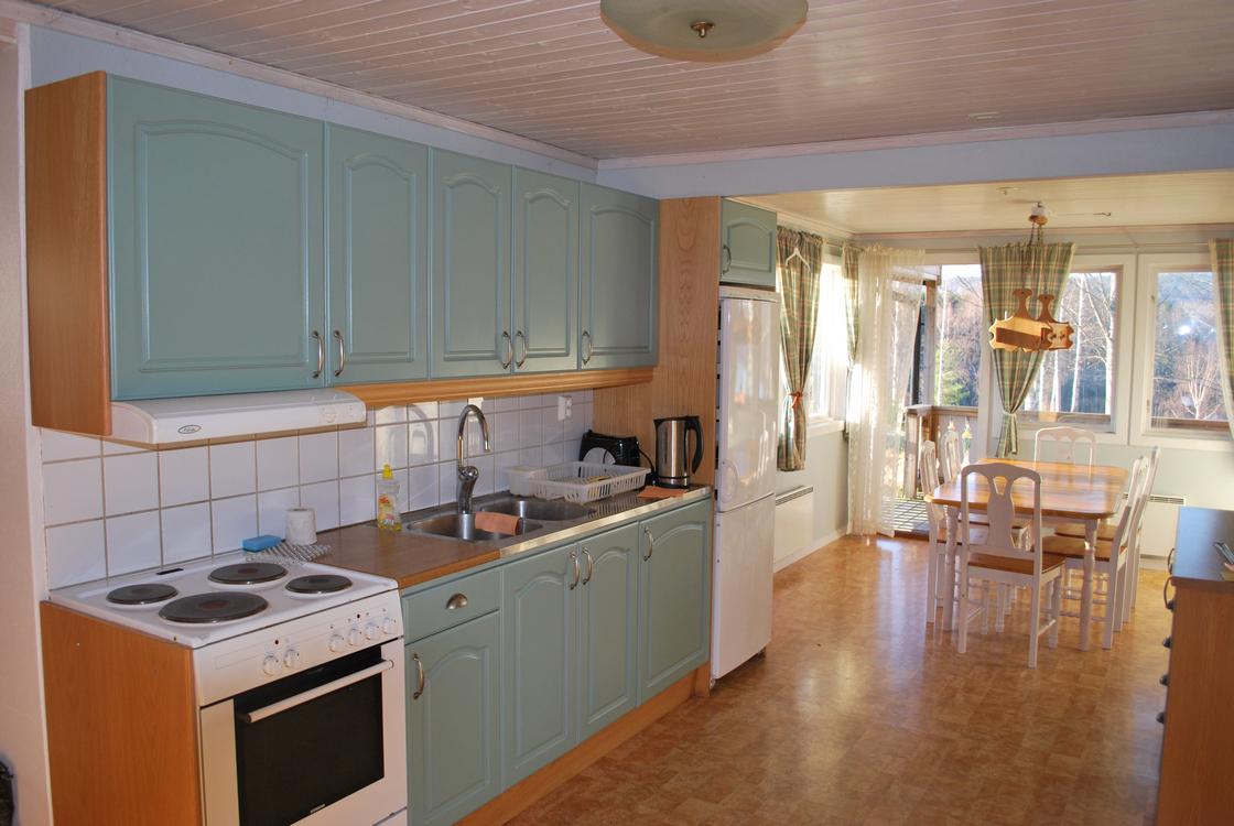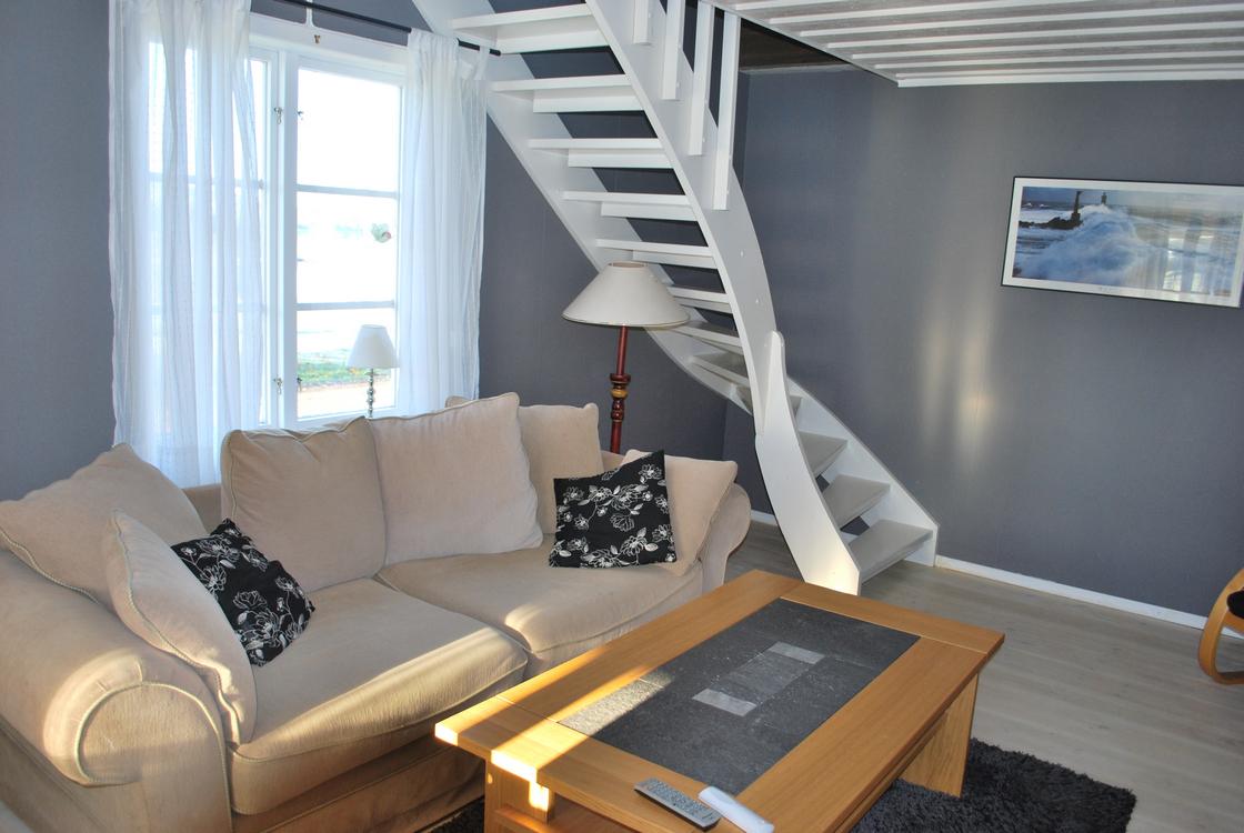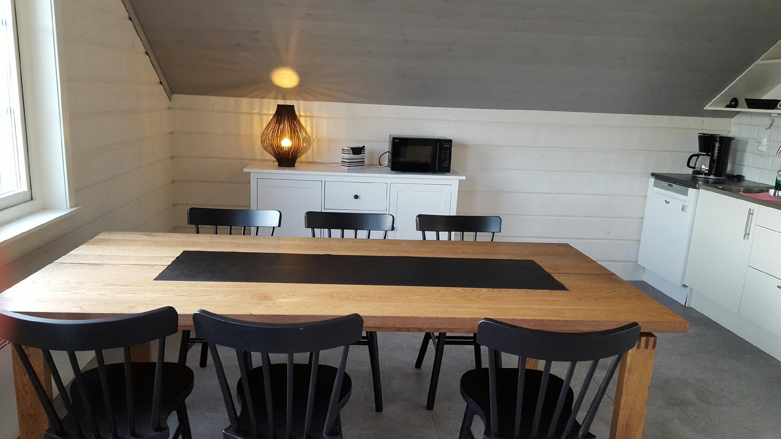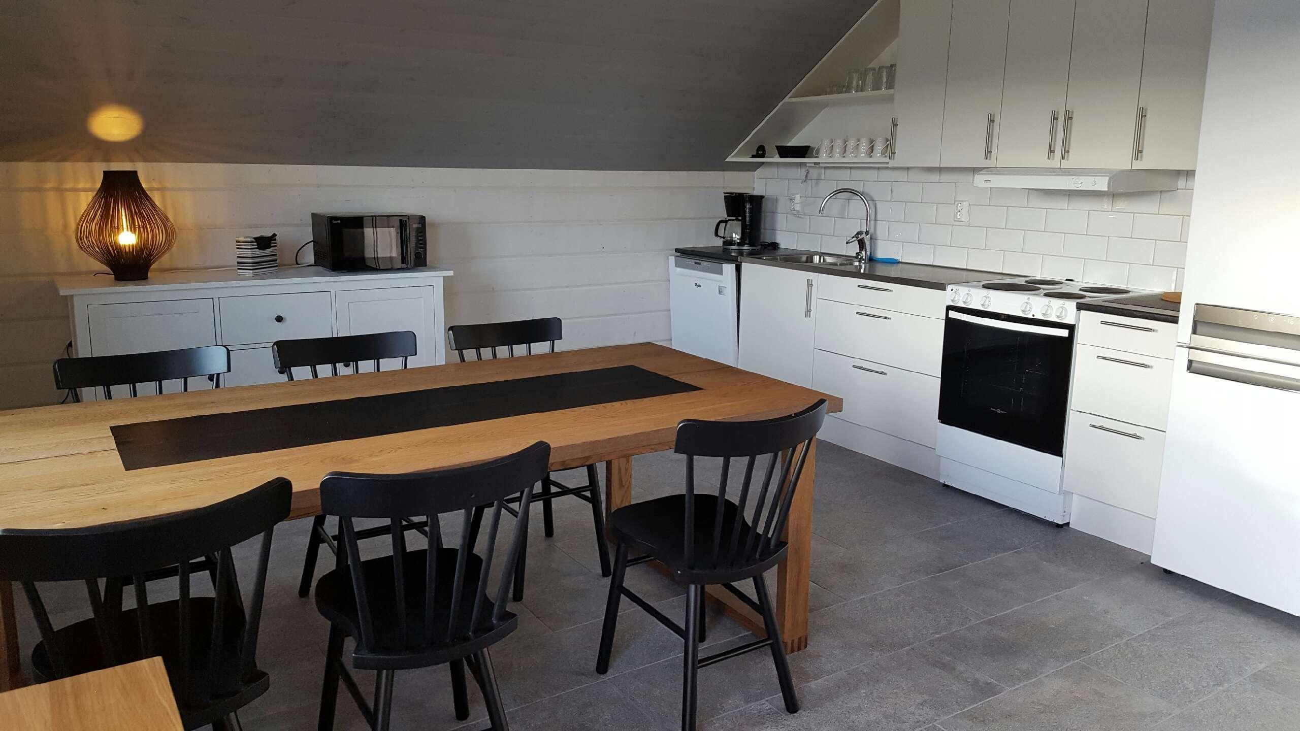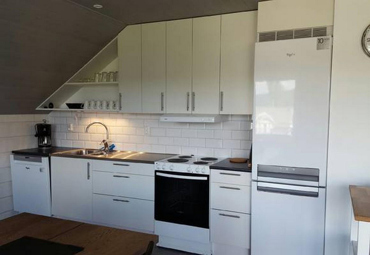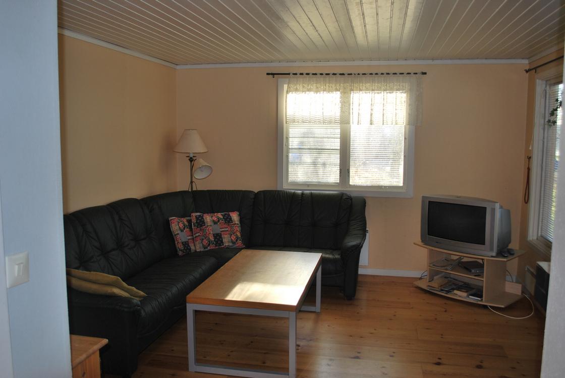 There is a leather sofa in the living room as well as a wood-burning stove and TV and there is a dining area in the open kitchen. There is also a spacious bathroom with shower / toilet and another large terrace with outdoor furniture.