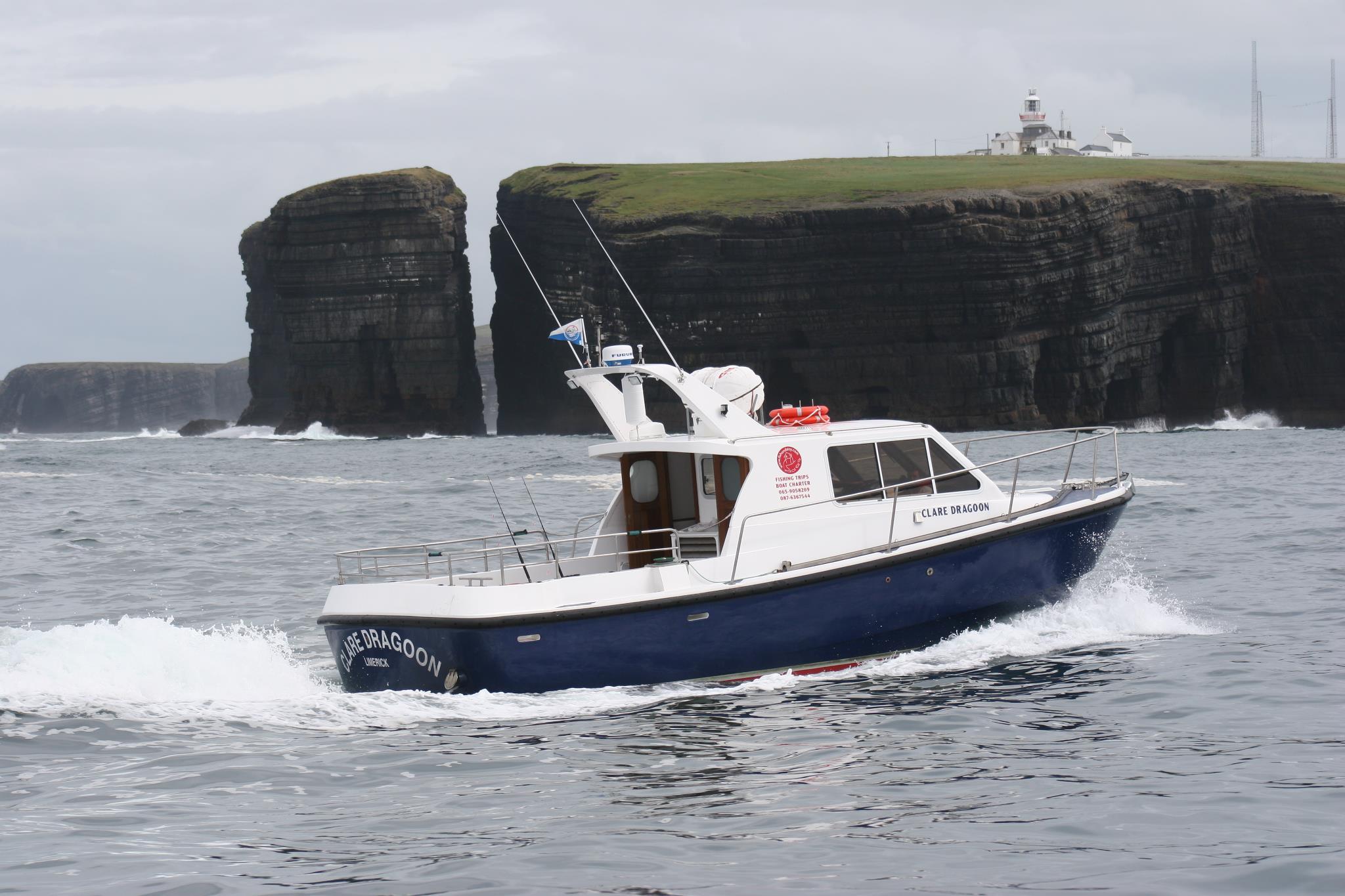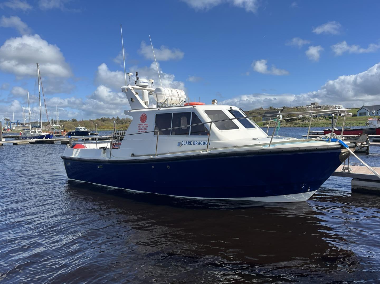 The Clare Dragoon is licensed to carry up to 12 passengers up to 30 miles offshore, is fully insured, and equipped with all necessary safety gear.