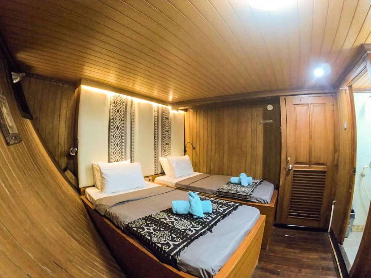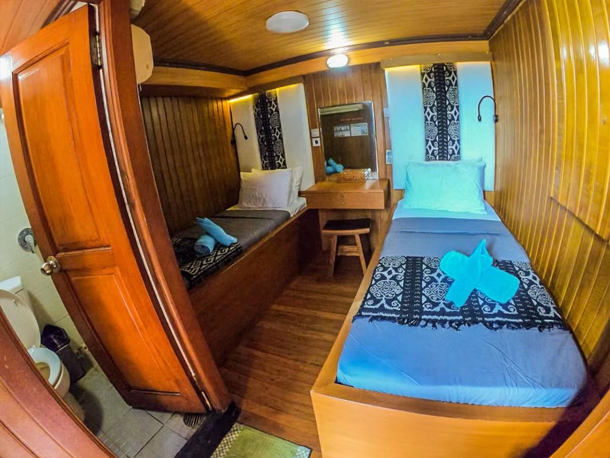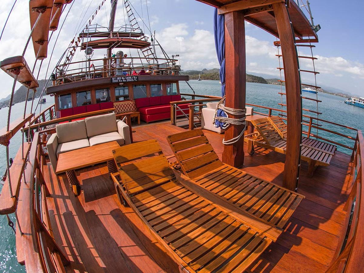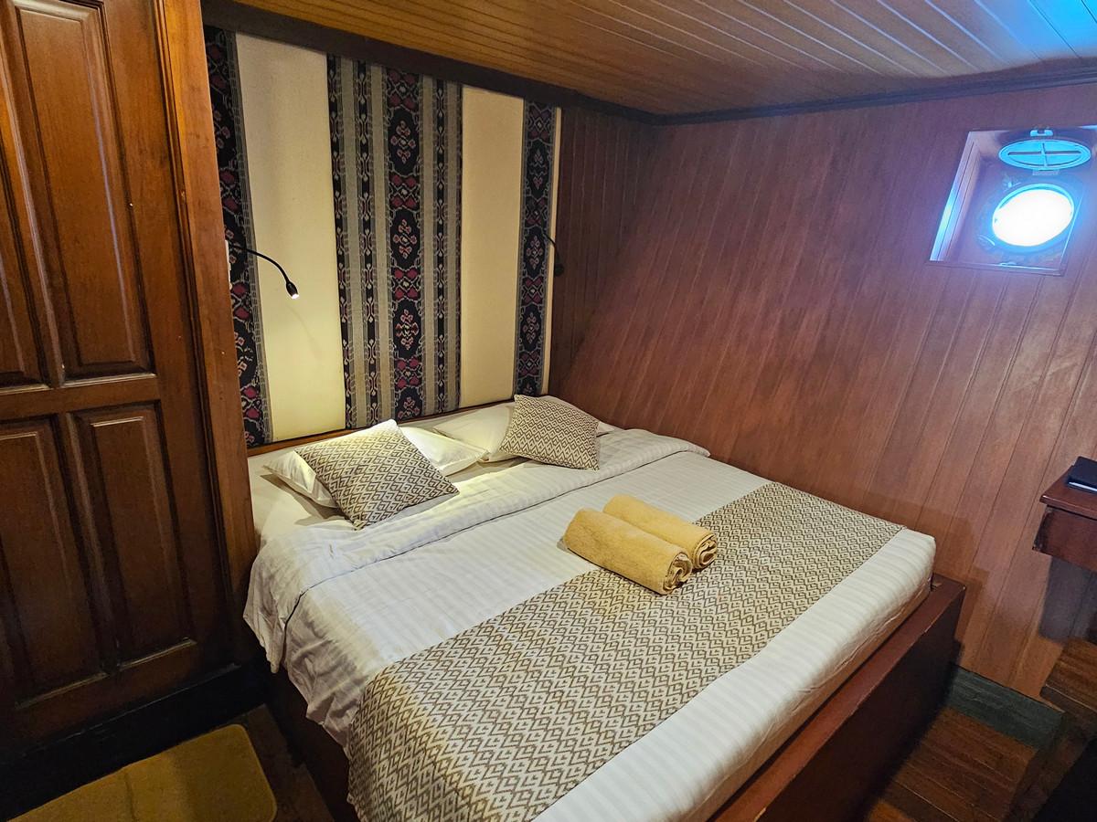 Phinisi Buginese Schooner, Ulin / Ironwood, Indonesia, 7 - 10 Knots, 36 m length, 9.5 m width; Accommodations: 10 deluxe cabins: 20 guests capacity, 6 double bed cabins, 4 twin bed cabins, en-suite bathroom with, hot & cold shower, air-conditioned cabins , hair dryer, bath robe & towels, safety box, hand sanitizer,