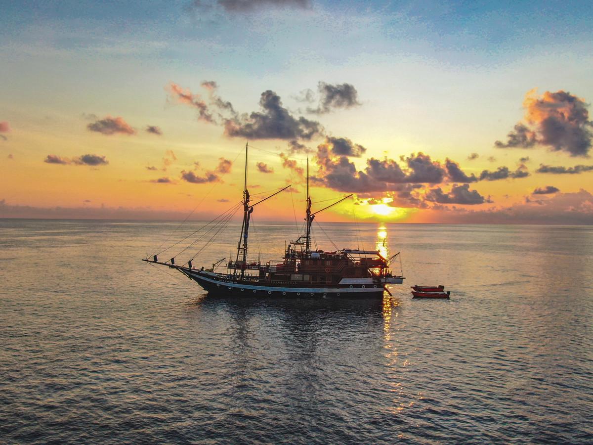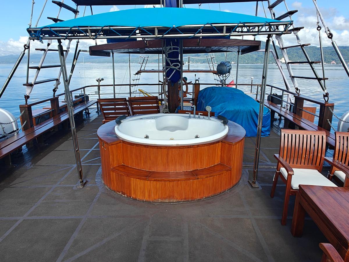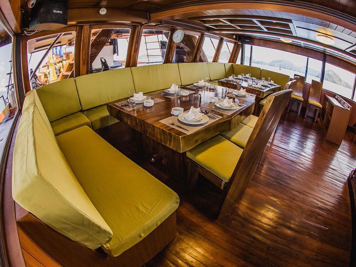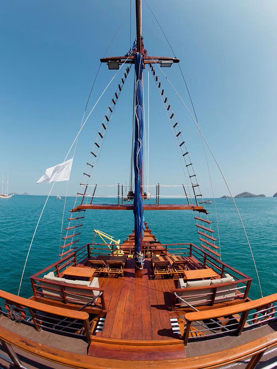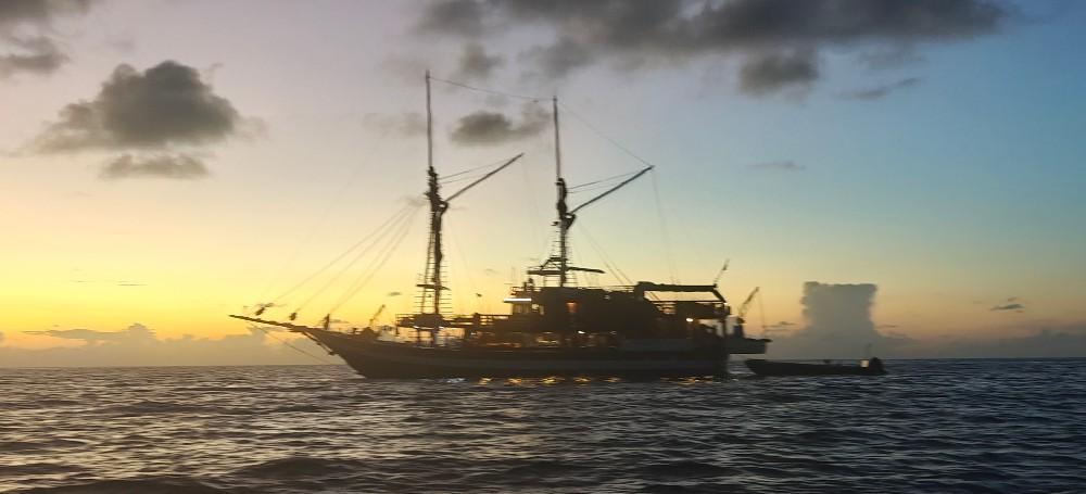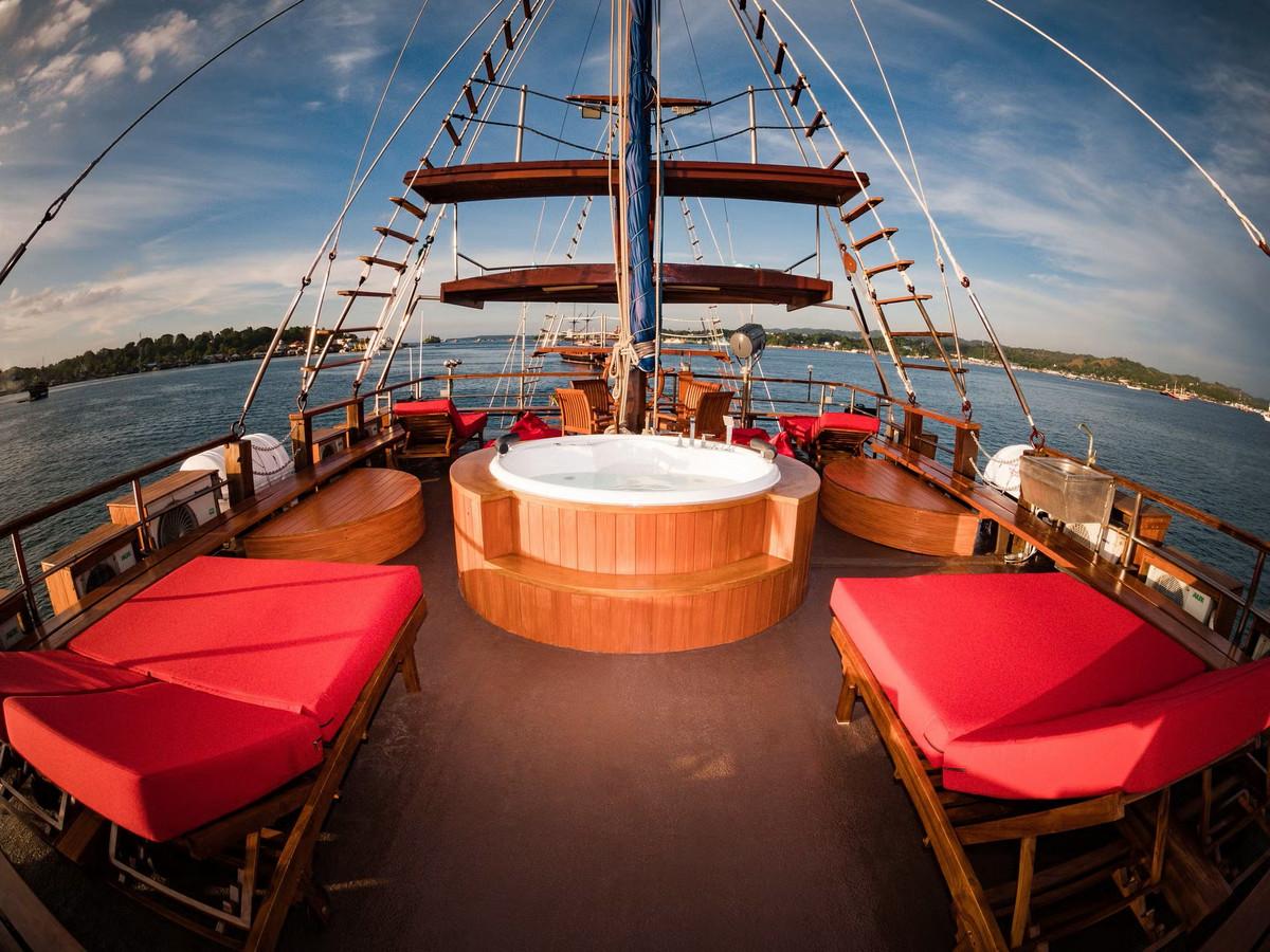 Phinisi Buginese Schooner, Ulin / Ironwood, Indonesia, 7 - 10 Knots, 36 m length, 9.5 m width; Accommodations: 10 deluxe cabins: 20 guests capacity, 6 double bed cabins, 4 twin bed cabins, en-suite bathroom with, hot & cold shower, air-conditioned cabins , hair dryer, bath robe & towels, safety box, hand sanitizer,