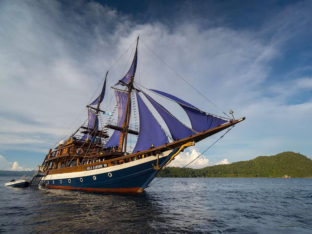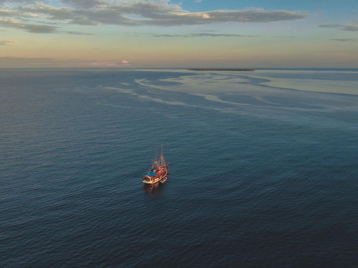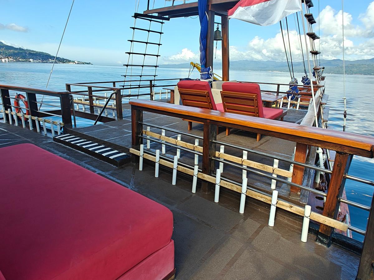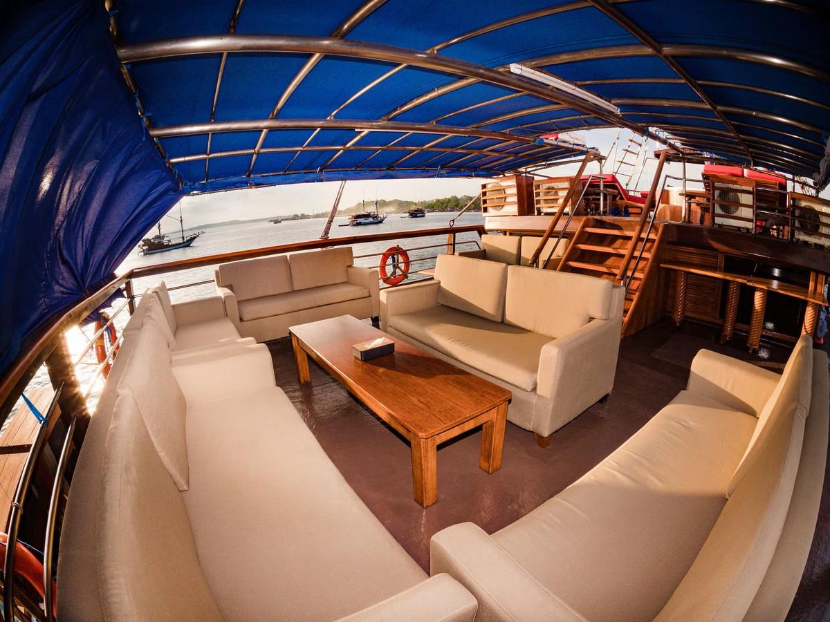 Phinisi Buginese Schooner, Ulin / Ironwood, Indonesia, 7 - 10 Knots, 36 m length, 9.5 m width; Accommodations: 10 deluxe cabins: 20 guests capacity, 6 double bed cabins, 4 twin bed cabins, en-suite bathroom with, hot & cold shower, air-conditioned cabins , hair dryer, bath robe & towels, safety box, hand sanitizer,