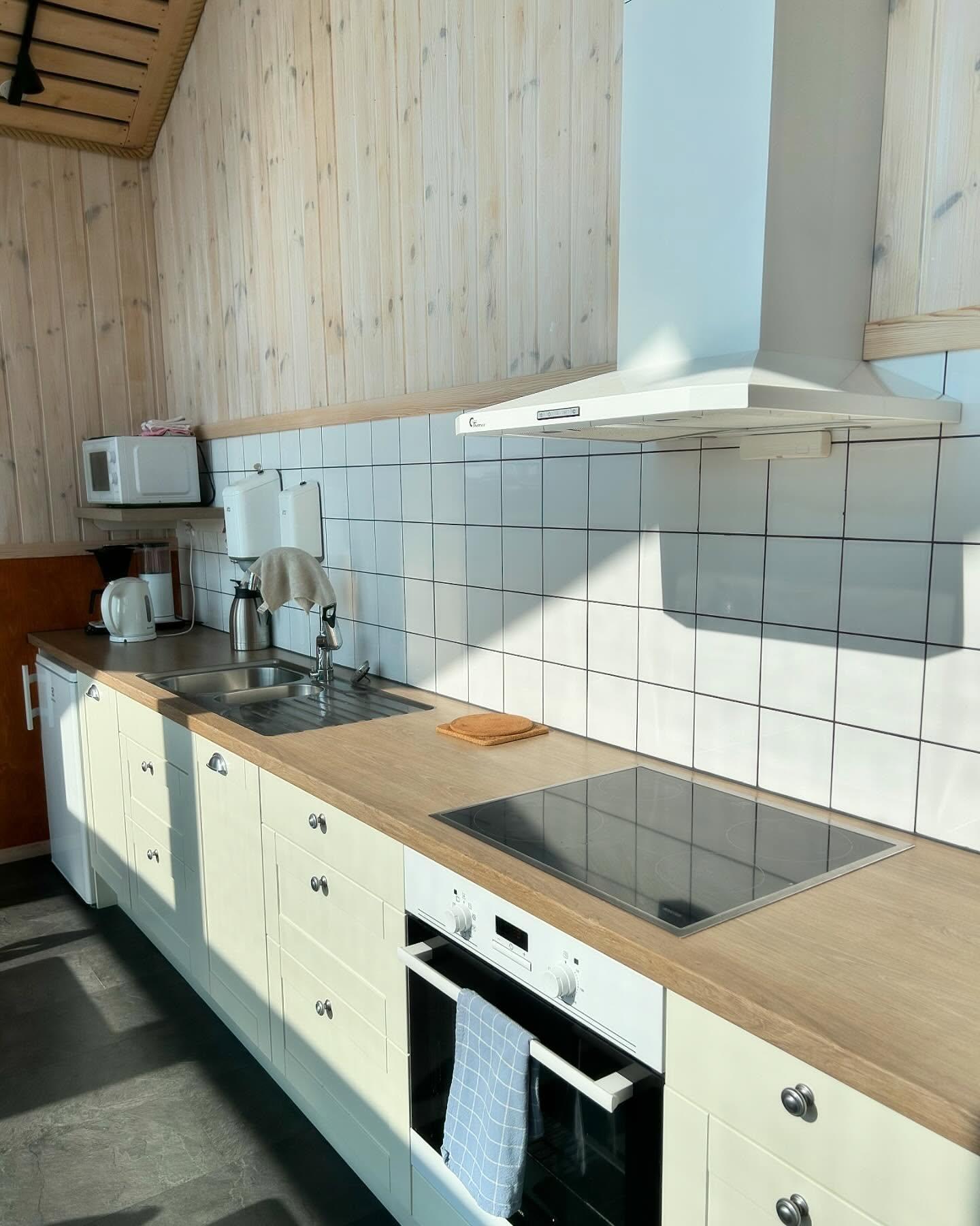 The location has five fully equipped holiday homes for up to six people each. The houses are equipped with three bedrooms, kitchen, refrigerator, oven, microwave, coffee maker, dishwasher. The houses are 80 m2, modern and neatly furnished with bedlinen and towels included. They all offer a direct view of the local bay and the Barents Sea and of course there is also the sauna.
