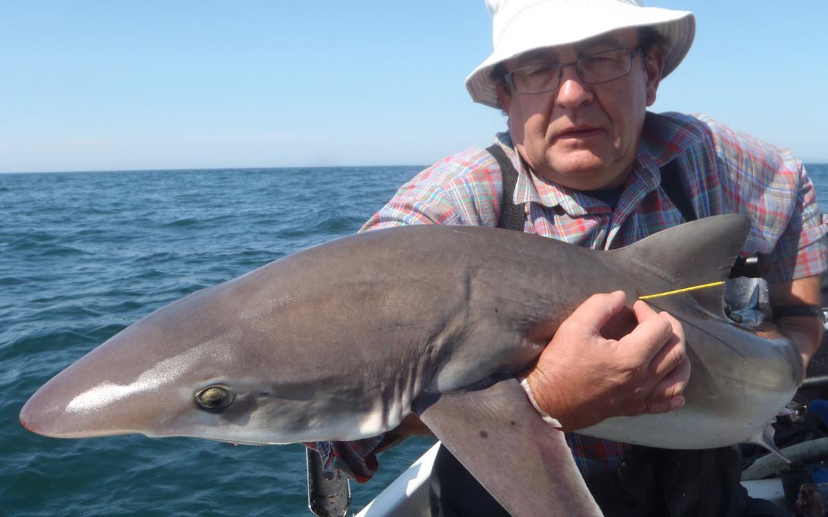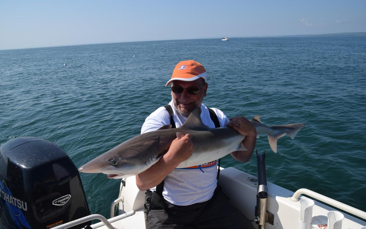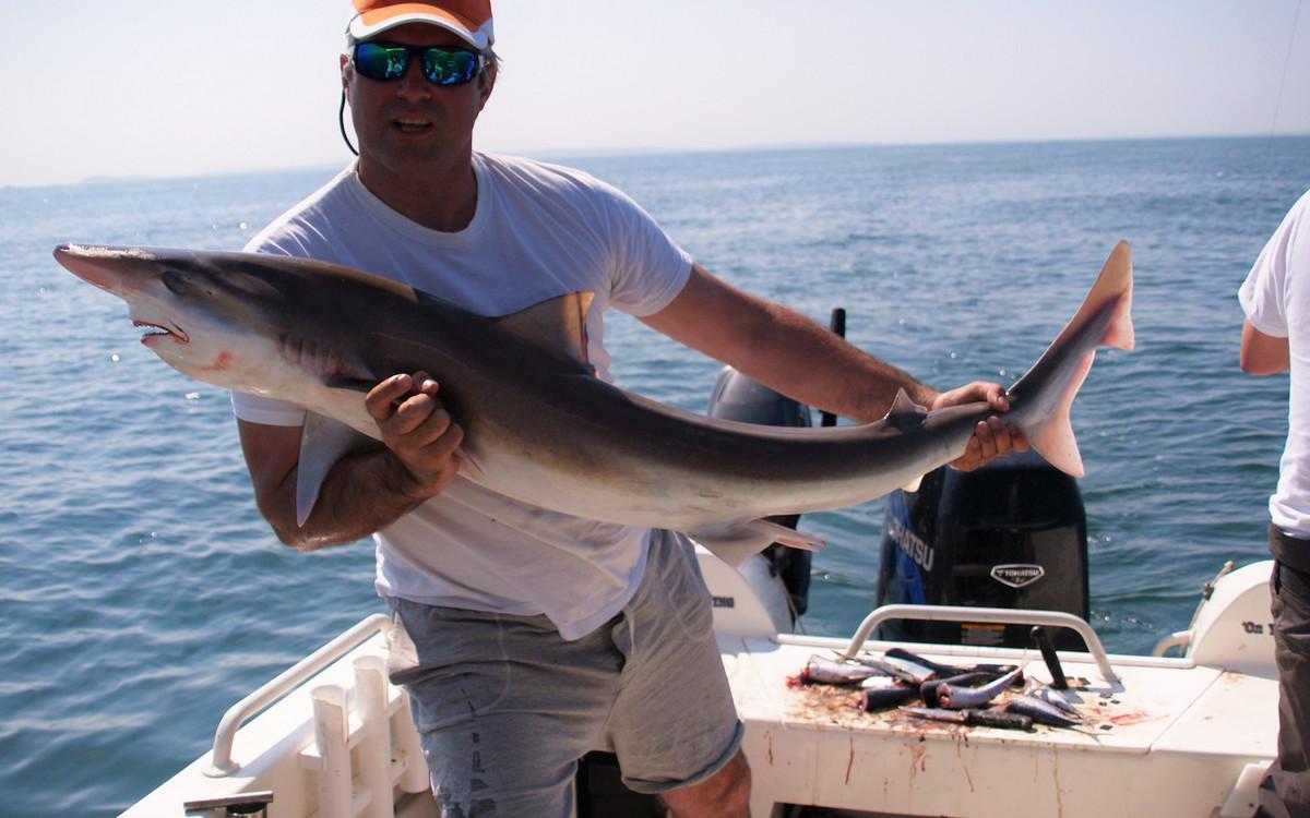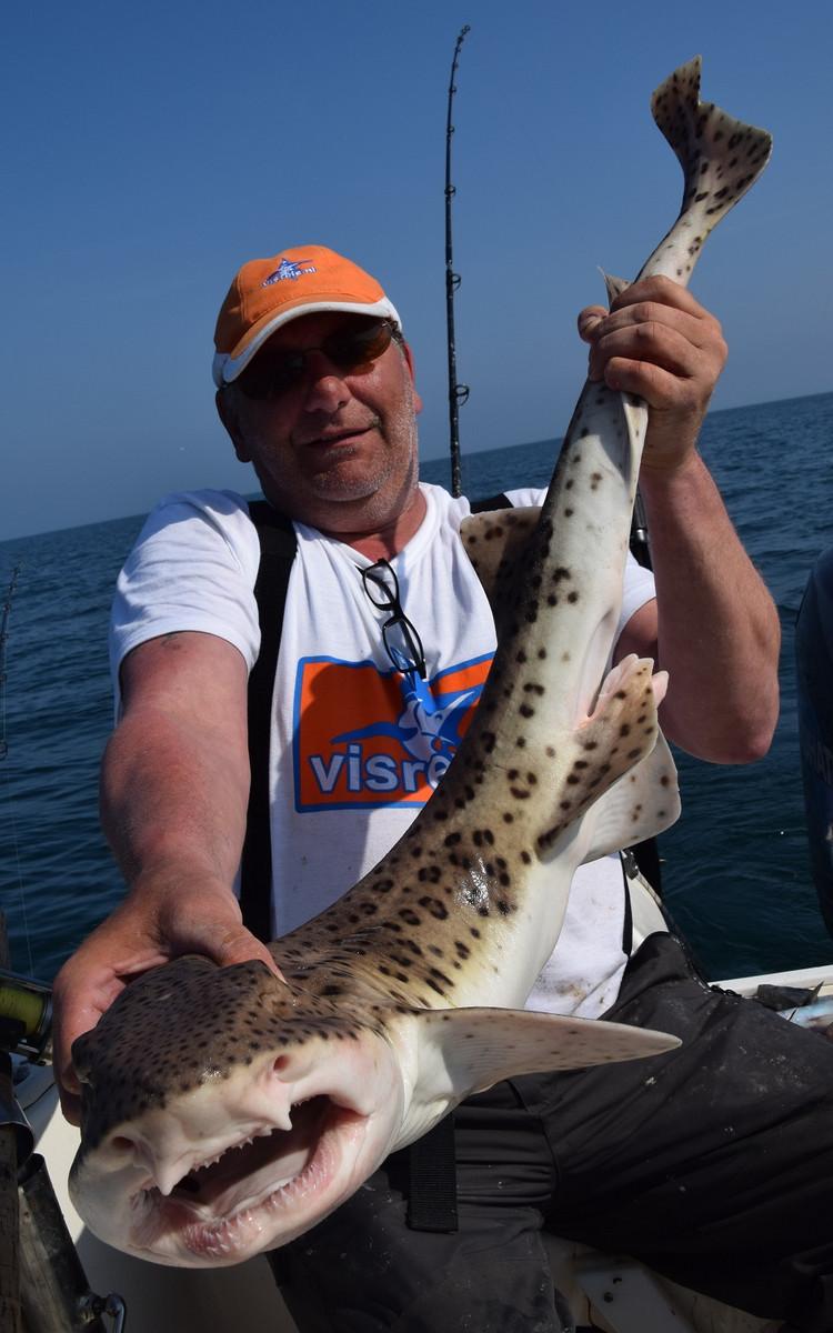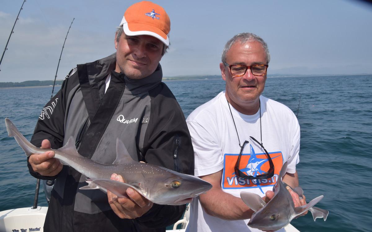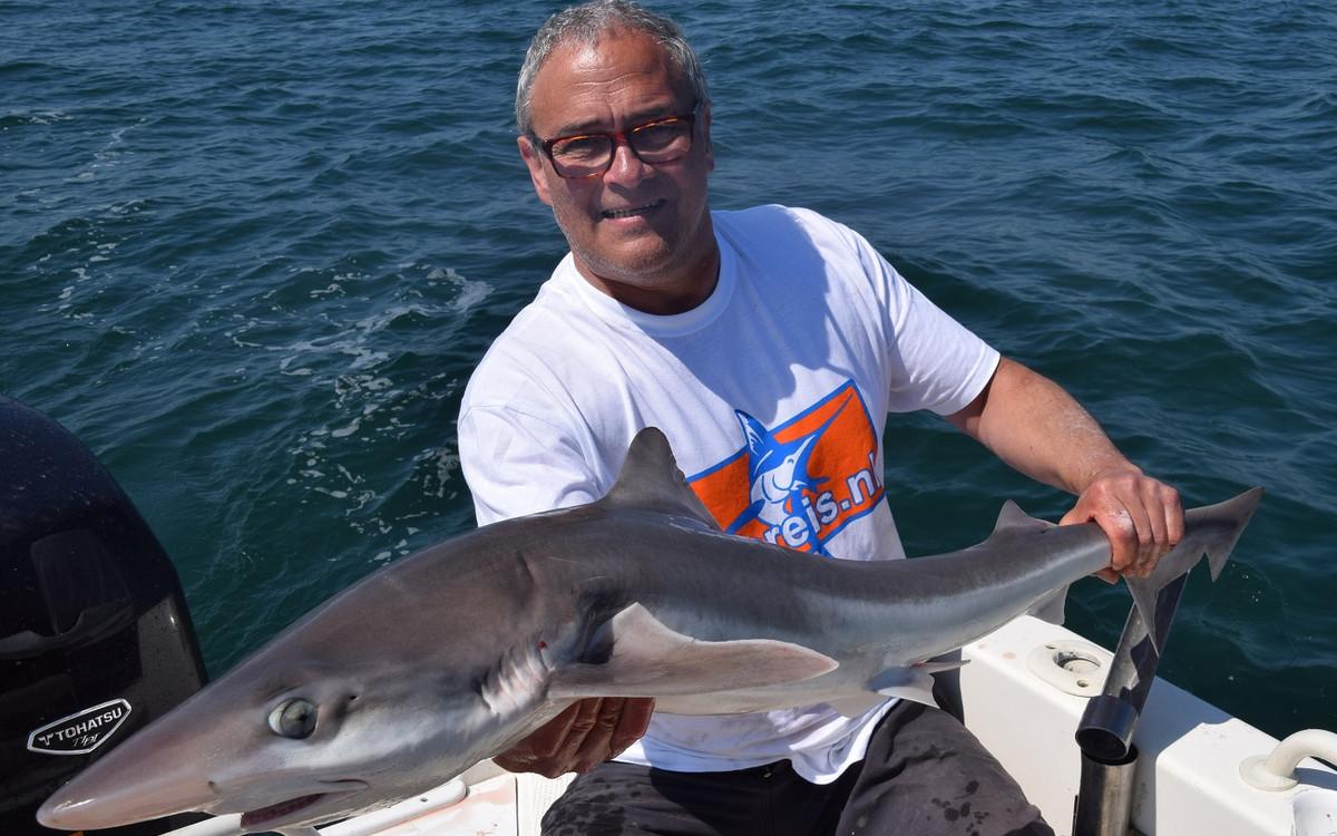 For the regular fishing of shark, ray and pollack you can go from May to October with the right weather conditions. But one of the most important species that is targeted here is the rough shark. There have been weeks in which more than 150 rough sharks have been caught by boat. Early in the season they target specimens of around 10 to 15 kilos of rough shark in only 10 meters depth with light rods of 6 to 12 lbs. This is a truly spectacular fishery. But also with the float, there is targeted fishing for rough shark. In the summer months, the fishery is a little further from the coast to locate the larger specimens of around 15 to 20 kilos. The average number per day is then around 10 to 12 specimens per boat. In September and October the numbers get a bit lower but the size increases to 25 to 30 kilos. While fishing for rough shark, bull huss, smooth shark, spiny dogfish and also different species of stingray are regularly caught. This is a very welcome bycatch in which most catches are simply made with mackerel as bait.