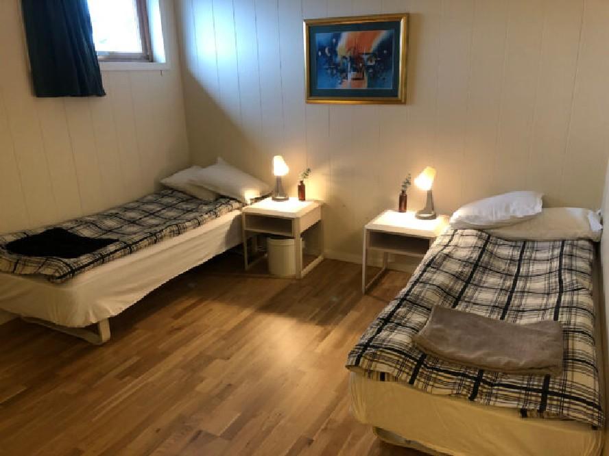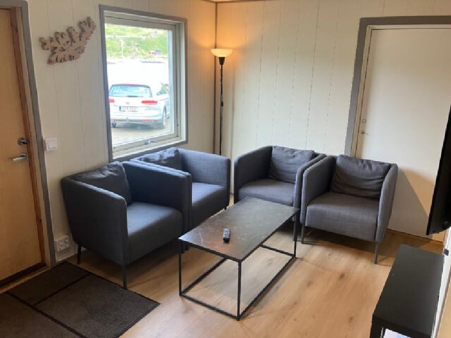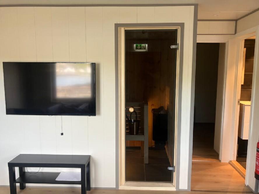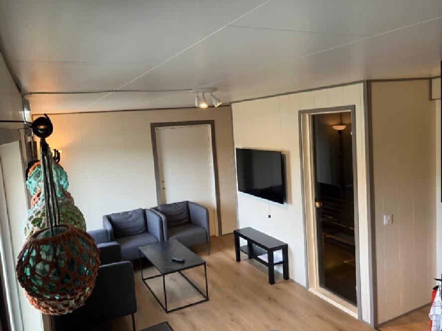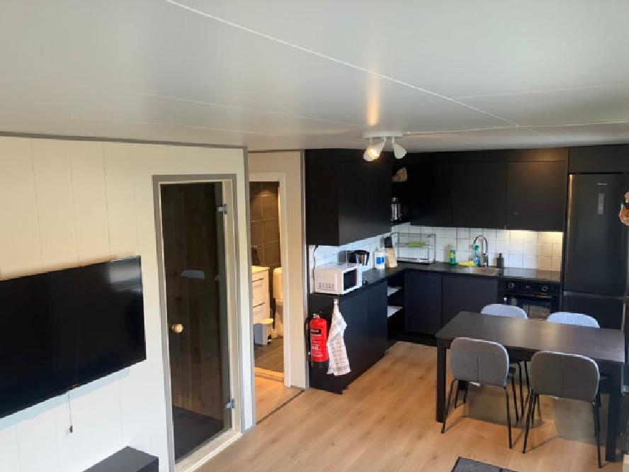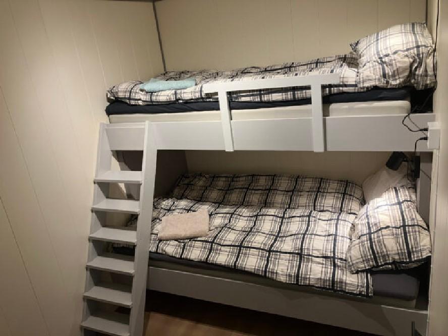 On the long side of the main building, two four-bedroom apartments both with separate entrances have been built. The apartments are compact but cleverly laid out. At 34 m2 you have space for four people in front of the TV which you can connect to via chromecast. There is a small sauna, toilet and shower. The kitchen is equipped with everything you need and a kitchen table where you can eat and of course rig up your fishing gear. There are two bedrooms each containing a spacious Norwegian bunk bed.