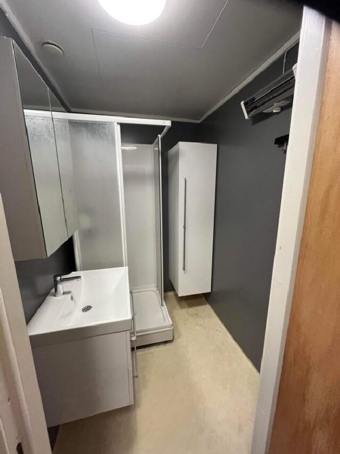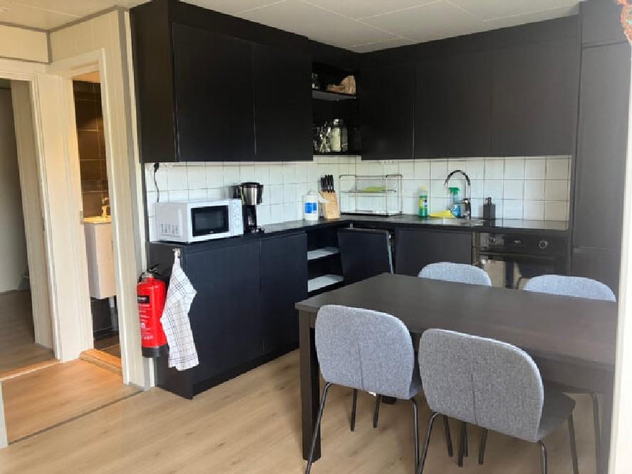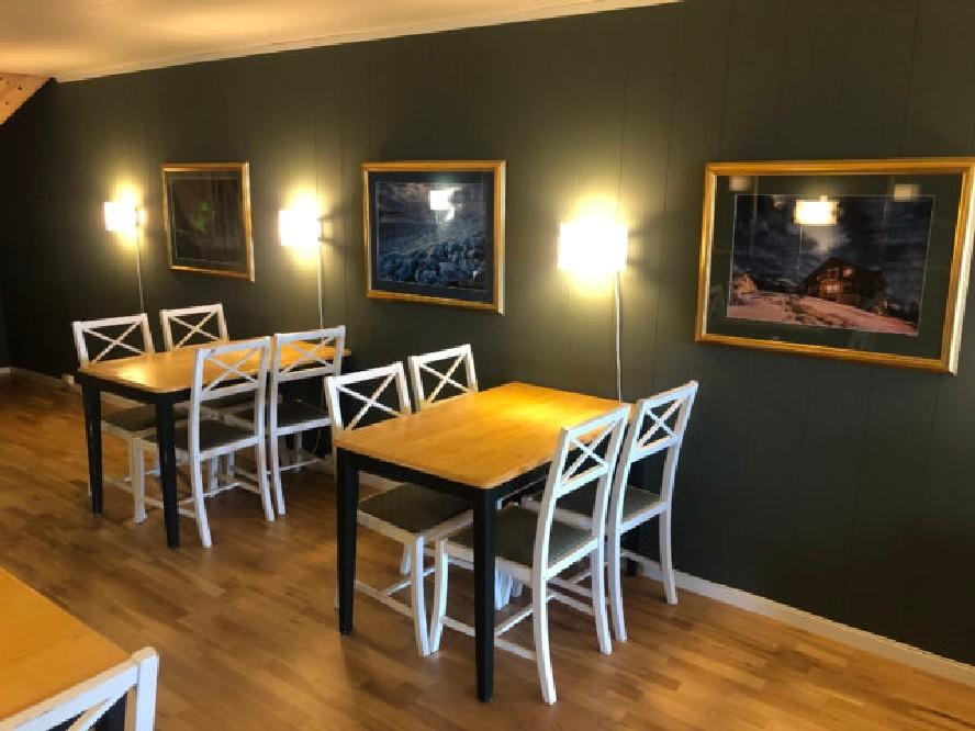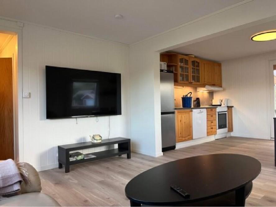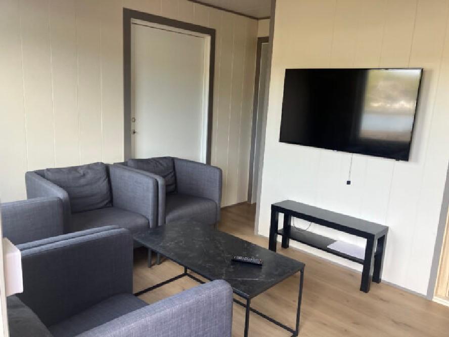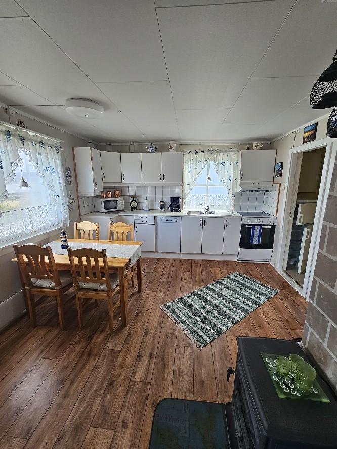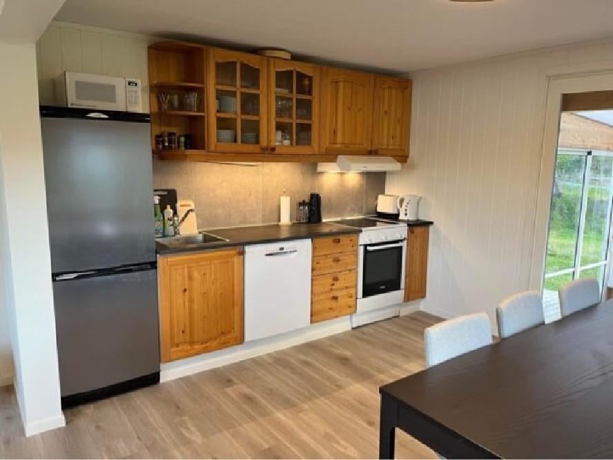 On the long side of the main building, two four-bedroom apartments both with separate entrances have been built. The apartments are compact but cleverly laid out. At 34 m2 you have space for four people in front of the TV which you can connect to via chromecast. There is a small sauna, toilet and shower. The kitchen is equipped with everything you need and a kitchen table where you can eat and of course rig up your fishing gear. There are two bedrooms each containing a spacious Norwegian bunk bed.