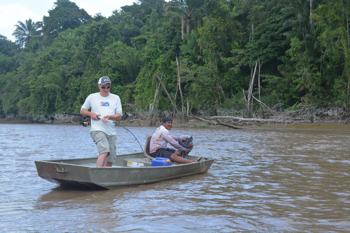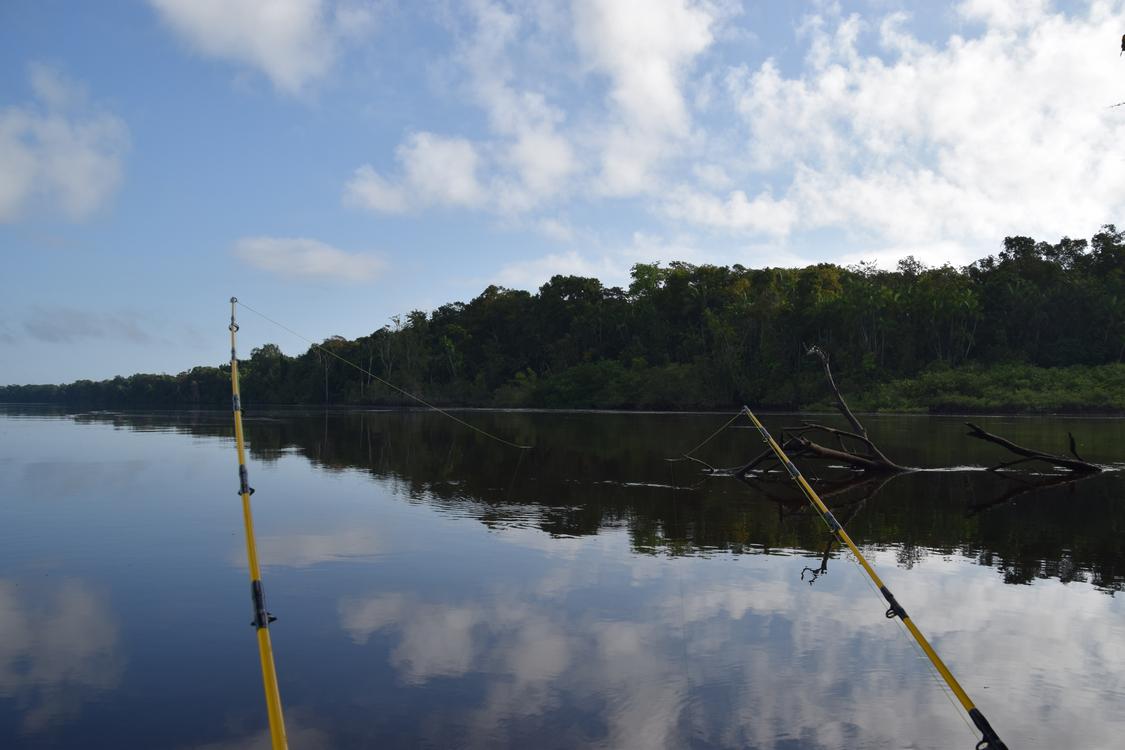 You fish with a maximum of 2 rods at a time because the current of the river makes it no use to fish with more rods at the same time, the lines will then always end up together. In addition to the targeted fishing for the large species and the very heavy rods, it is wise to take a solid bass rod with a 5000 reel and dyneema of 20 kilos breaking force. And a spinning rod around 30 - 70 grams and a baitcaster for the smaller species. At the pontoon there is an aluminium boat of 15 feet with 15 HP engine available per two anglers. This is used, among other things, to chase large fish and to be able to drill them in a perfect way. The strikes of the big fish as lau lau and tarpon are often during the tidal changes. In the other periods you can take the aluminium boat out on small side branches of the river to look for the other and slightly smaller predators.